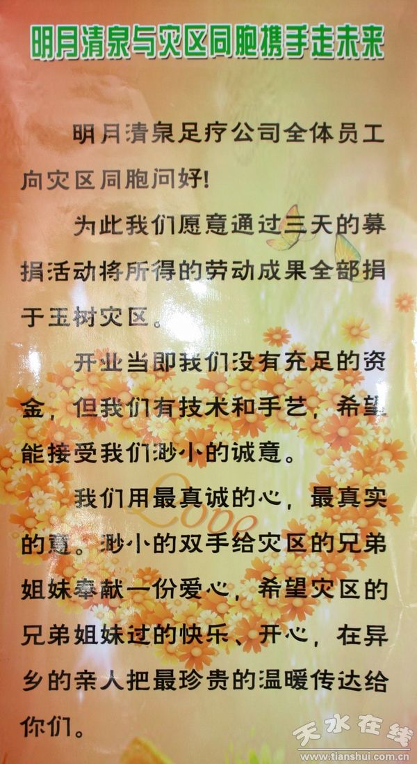 5月2日,明月清泉足療公司全體員工為玉樹地震災(zāi)區(qū)捐款四千元奉獻(xiàn)愛心。