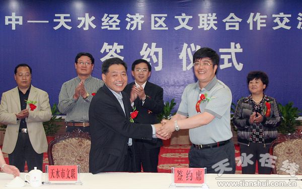 5月22日,《關(guān)中——天水經(jīng)濟(jì)區(qū)文聯(lián)合作交流協(xié)議》簽約儀式在甘肅天水舉行。陜西省文聯(lián)黨組成員、專職副主席黃道峻與甘肅省天水市文聯(lián)黨組成員、副主席張映水,分別代表陜西省文聯(lián)和天水市文聯(lián)簽署了協(xié)議。天水市委常委、市委宣傳部部長(zhǎng)王光慶出席協(xié)議簽署儀式。