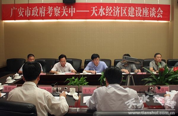 8月25日至26日,四川省廣安市委常委、常務(wù)副市長庭繼崗率領(lǐng)廣安市政府考察團(tuán)一行在天水市就關(guān)中—天水經(jīng)濟(jì)區(qū)建設(shè)情況進(jìn)行了參觀考察。天水市副市長龍章月在天水賓館會(huì)見了庭繼崗一行,雙方進(jìn)行了親切友好的座談交流。