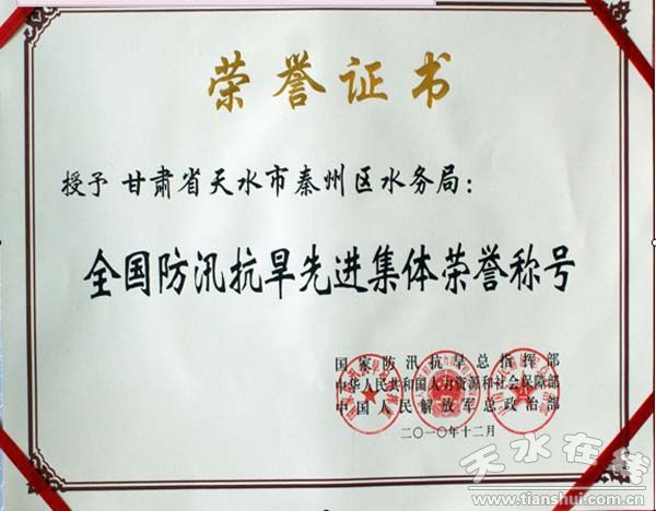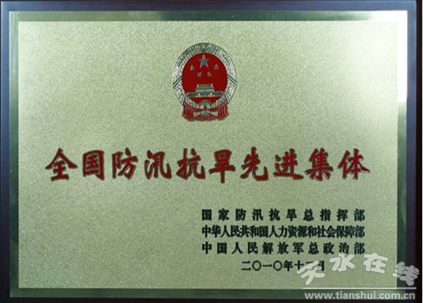 天水市秦州區(qū)水務(wù)局被授于“全國(guó)防汛抗旱先進(jìn)集體”榮譽(yù)稱號(hào),天水市抗旱防汛指揮部辦公室副主任劉小平同志被授予“全國(guó)防汛抗旱先進(jìn)個(gè)人”榮譽(yù)稱號(hào),并享受省部級(jí)勞動(dòng)模范和先進(jìn)工作者待遇。
