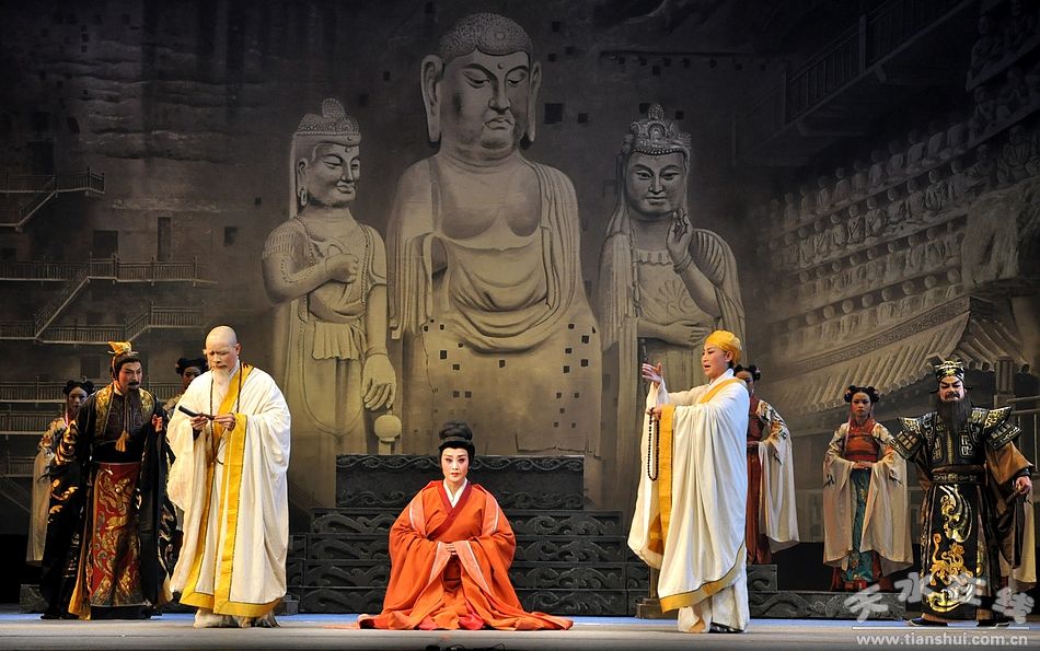 兩個小時的演出,現(xiàn)場觀眾隨著乙佛氏命運(yùn)的悲歡離合和演員精彩的表演,報(bào)以高潮迭起,此起彼伏的掌聲。一位在文化部工作的陜西籍吳先生告訴記者,《麥積圣歌》無論是唱腔、舞美都比較柔和,娓娓道來,聽著很享受。特別是舞臺背景將麥積山石窟藝術(shù)的精華呈現(xiàn)給觀眾,不僅讓我們了解了麥積山石窟一段充滿佛理人生的悲情故事,而且凸顯了麥積山石窟藝術(shù)的輝煌燦爛。遺憾的是自己還沒有去過天水,一旦有機(jī)會,他一定要去看看麥積山這座充滿神奇色彩的藝術(shù)寶庫。