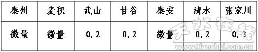秦州:李子1.7 齊壽1.3 麥積:石門1.0 武山:馬力1.0 洛門1.4 清水:草川1.3 秦亭3.0 山門3.0 張家川:關山牧場1.6 平安1.2
