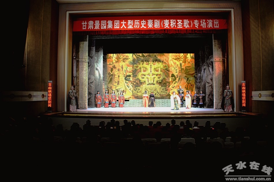 市委常委、副市長郭奇若觀看演出,并在演出結(jié)束后登臺接見全體演職人員,祝賀全部由市秦劇團演員擔綱主演的《麥積圣歌》成功演出。