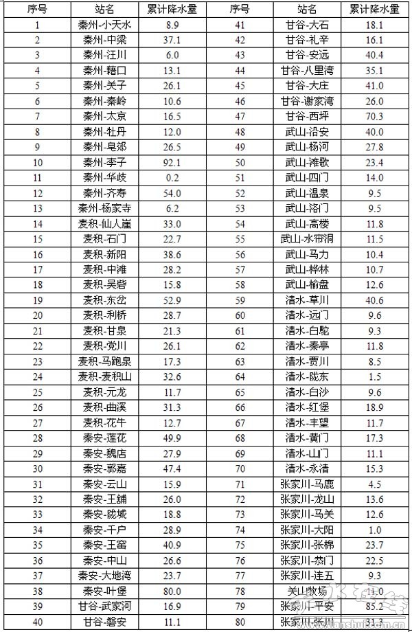 秦州11.4、麥積18.0、秦安31.9、甘谷23.9、武山11.4、清水14.7、張家川18.0。