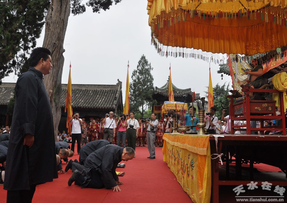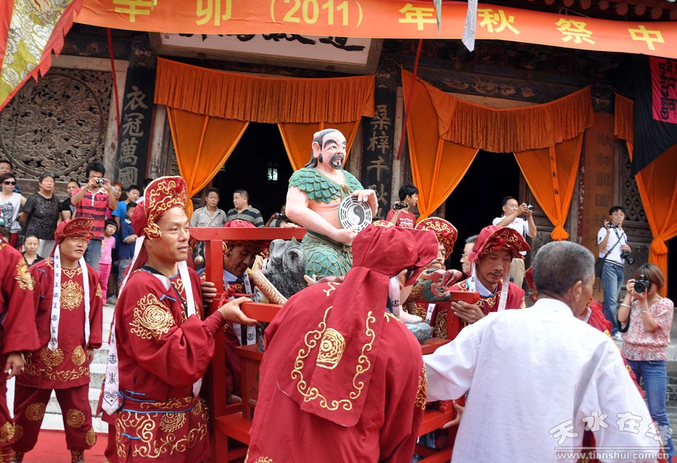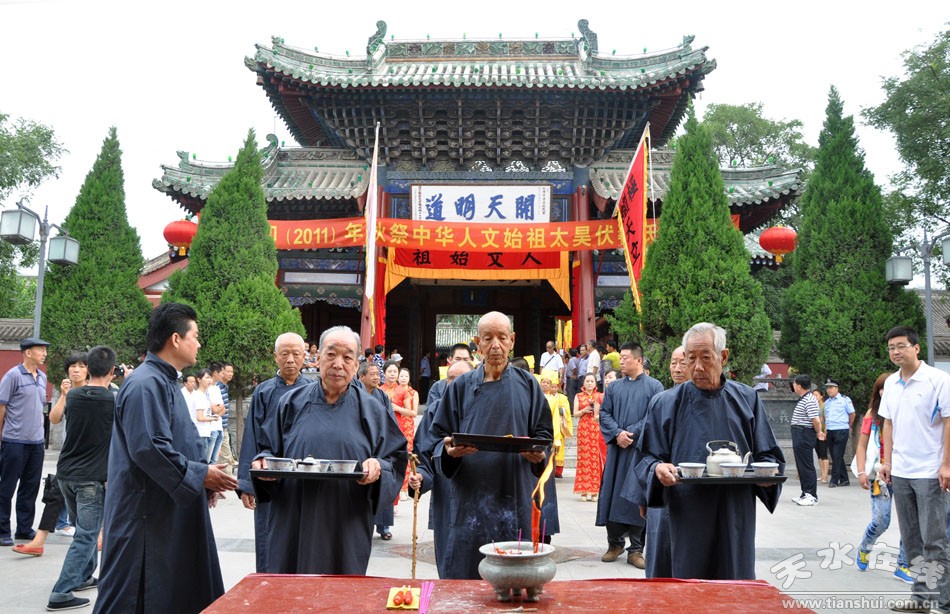 2011年8月17日(農(nóng)歷辛卯年七月十八),辛卯(2011)年秋祭中華人文始祖太昊伏羲氏典禮在天水伏羲廟內(nèi)開(kāi)始分項(xiàng)舉行祭禮儀式。據(jù)悉,農(nóng)歷七月十九日為伏羲逝世紀(jì)念日,每年伏羲廟都要舉行為期三天的祭祀活動(dòng)。今天主要進(jìn)行的是迎神、迎圣水、出榜文儀式,明天8:30分還將舉行迎獻(xiàn)飯儀式,正式祭祀將于明天9:50分開(kāi)始。