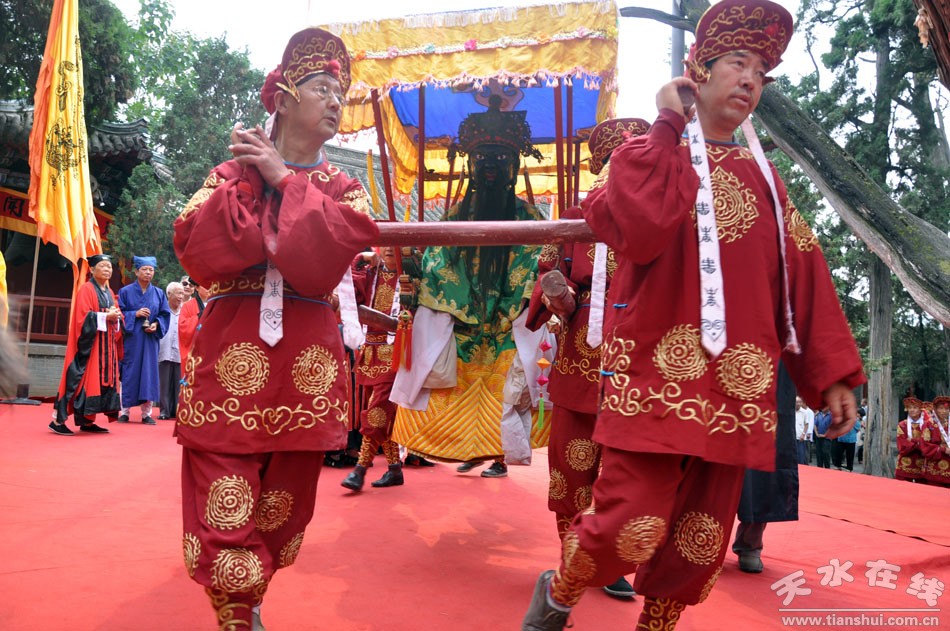 上午 9:00時(shí)整,方神黑爺從方神廟起駕,同儀仗隊(duì)、嗩吶隊(duì)入伏羲廟。方神黑爺拜伏羲后,在伏羲廟后院圣泉舉行迎取圣水儀式。取水后,恭請(qǐng)伏羲行像,抬《伏羲廟榜文》,儀仗隊(duì)鳴鑼開(kāi)道,嗩吶隊(duì)伍跟隨演奏,出廟門至戲樓處,舉行出榜文儀式。伏羲廟榜文懸掛之后,圣水、儀仗隊(duì)、嗩吶隊(duì)、伏羲行像、黑爺像,依次出伏羲城東門,經(jīng)雙橋大街,行至伏羲廣場(chǎng)南側(cè)大道,由廣場(chǎng)南側(cè)牌坊登廣場(chǎng)祭壇。按當(dāng)日喜神方位,設(shè)香案,請(qǐng)伏羲行像和方神黑爺像落座。圣水放于伏羲行像之前的香案上。主祭人明燭、焚香、化表、獻(xiàn)茶、鳴炮,主持詠?lái)炗袂?