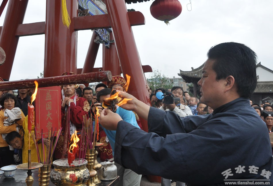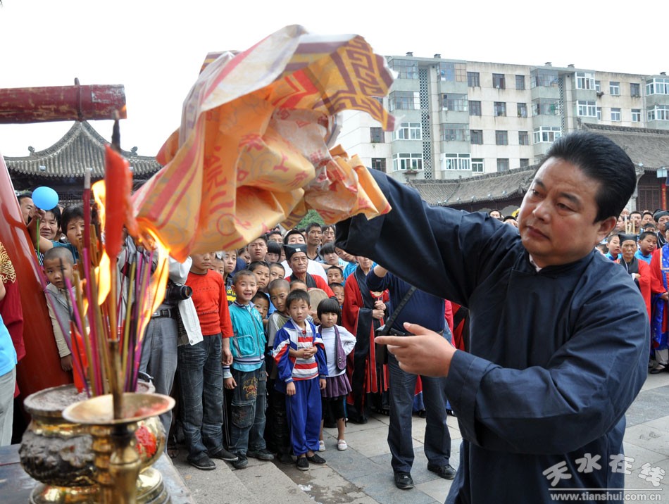 農(nóng)歷七月二十日(公歷8月19日)下午,辛卯(2011)年秋祭中華人文始祖伏羲典禮送神、送圣水、焚榜文儀式隆重舉行。儀式開始后,請方神黑爺進(jìn)入伏羲廟,舉行送神儀式,明燭、焚香、化表、獻(xiàn)茶;然后,在伏羲廟西牌坊前舉行送圣水、焚榜文儀式,將榜文焚燒,與祭文灰、圣水一同送往藉河長流水中。