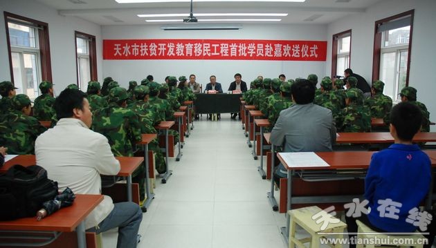 2011年9月11日上午,天水計(jì)算機(jī)專修學(xué)院舉行隆重的儀式,歡送我市“扶貧開(kāi)發(fā)教育移民”工程首批35名學(xué)員赴嘉興。這35名學(xué)員在該院接受了20多天的文化技能培訓(xùn)結(jié)業(yè)后,將離開(kāi)家鄉(xiāng)天水到浙江嘉興繼續(xù)接受職業(yè)技能培訓(xùn)并在當(dāng)?shù)鼐蜆I(yè)、工作生活。天水市人大常委會(huì)主任任伯年、省扶貧辦科教處處長(zhǎng)杜明華、市政府副秘書(shū)長(zhǎng)楊勝利、天水市扶貧開(kāi)發(fā)辦公室主任張棟梁等領(lǐng)導(dǎo)出席了歡送儀式。