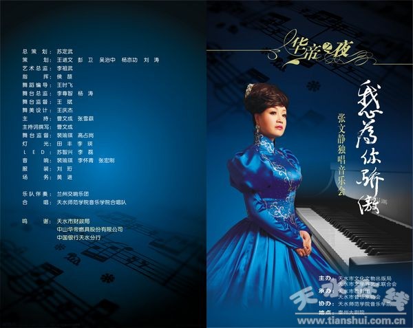 主 辦:天水市文化文物出版局 天水市文學藝術界聯(lián)合會 承辦單位:天水市歌舞團 協(xié) 辦 : 天水市音樂家協(xié)會 中山華帝股份有限公司 天水師范學院音樂學院 鳴 謝: 中國銀行天水分行 演出時間:2012年1月5日 演出地點:天水市秦州大劇院