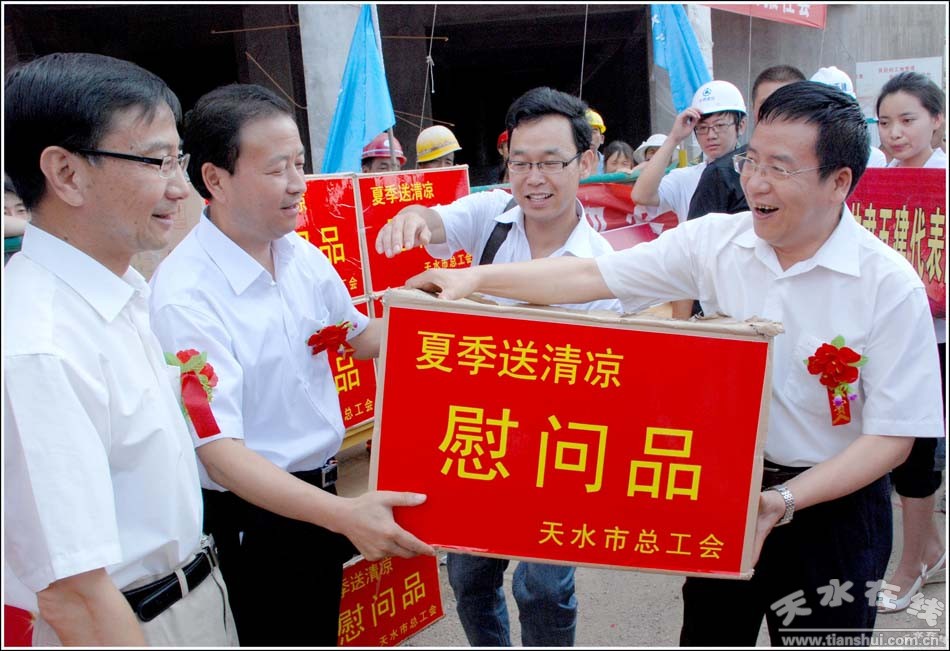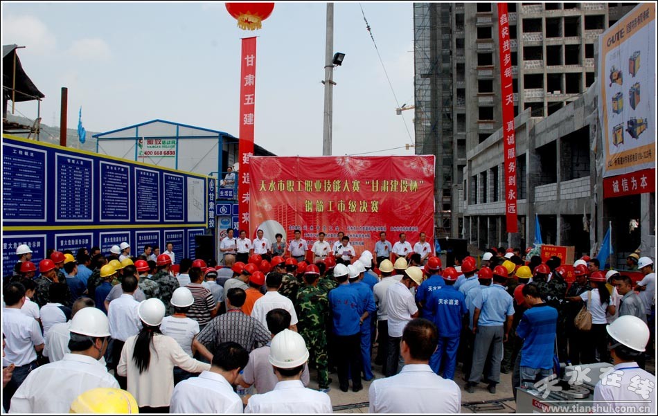 (天水市職工職業(yè)技能大賽“甘肅建投杯”鋼筋工市級決賽暨“夏季送清涼”活動在甘肅五建集團承建的秦州區(qū)錦秀苑工地舉行)
