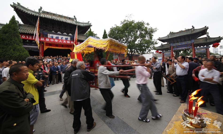 相傳農(nóng)歷七月十九日是伏羲氏仙逝紀(jì)念日,其祭祀活動(dòng)由“上元會(huì)”組織當(dāng)?shù)厝罕娕e行祭祀儀式,邀請(qǐng)當(dāng)?shù)厍厍粦虬喑獟煲聭蛉欤漓氤绦蜉^為簡(jiǎn)單。2009年始,為了搞好國(guó)家級(jí)非物質(zhì)文化遺產(chǎn)保護(hù)項(xiàng)目—太昊伏羲祭典的保護(hù)傳承和伏羲文化的研究,天水博物館倡議,請(qǐng)熱心伏羲文化研究的仁人志士籌備申請(qǐng)成立“天水市民間祭祀伏羲協(xié)會(huì)”,擴(kuò)大祭祀影響,逐漸恢復(fù)傳承歷史秋祭典禮。自此,祭祀活動(dòng)由天水市民間祭祀伏羲協(xié)會(huì)(籌)、天水市博物館和“上元會(huì)”共同組織實(shí)施秋季伏羲典禮,其規(guī)格、規(guī)模和程序均參照春祭活動(dòng)進(jìn)行,時(shí)間從農(nóng)歷七月十八日至七月二十日,為期三天。農(nóng)歷七月十八日上午9:00時(shí)(具體時(shí)間按當(dāng)日民俗喜神當(dāng)值方位和時(shí)間確定),舉行迎神、安神、出榜文儀式;農(nóng)歷七月十九日上午8:00 時(shí),迎供獻(xiàn)飯,9:50正式祭祀;農(nóng)歷七月二十日午場(chǎng)戲尾聲,舉行送神儀式。活動(dòng)期間,邀請(qǐng)秦腔劇團(tuán)公演秦腔劇目。秋祭伏羲活動(dòng)中的請(qǐng)神、安神、迎獻(xiàn)飯等儀式和春祭活動(dòng)基本相似,但取圣水儀式是根據(jù)每年龍王治水風(fēng)俗而定。