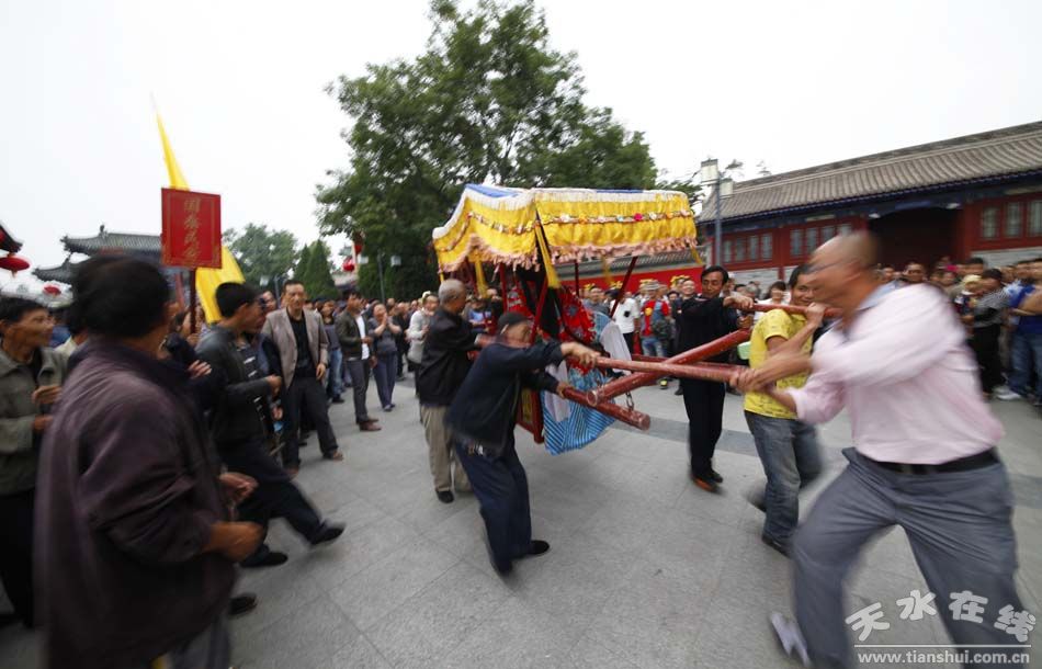 農(nóng)歷七月十八日上午9:00時(shí),方神黑爺從方神廟起駕,在儀仗隊(duì)、嗩吶隊(duì)的護(hù)送下進(jìn)入伏羲廟。恭請(qǐng)伏羲行像,儀仗隊(duì)鳴鑼開道,出廟門至戲樓前,舉行出榜文儀式。榜文懸掛之后,儀仗隊(duì)、嗩吶隊(duì)、伏羲行像、黑爺像,依次出伏羲城東門,經(jīng)雙橋大街,行至伏羲廣場(chǎng)南側(cè)大道,由廣場(chǎng)南側(cè)牌坊登廣場(chǎng)祭壇。按當(dāng)日喜神方位,設(shè)香案,請(qǐng)伏羲行像和方神黑爺像安座。主祭人明燭、焚香、化表、獻(xiàn)茶、鳴炮,主持詠頌迎神曲: