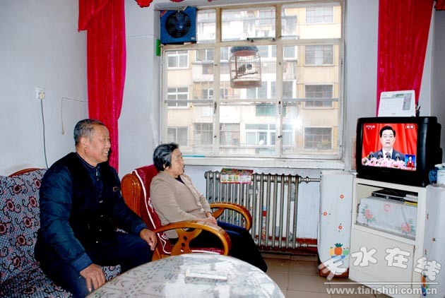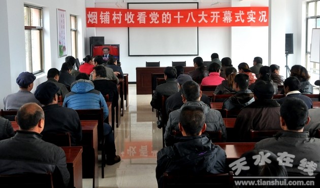 (圖為因大櫻桃而聞名的秦州區(qū)玉泉鎮(zhèn)煙鋪村組織村民收看黨的十八大開幕實況直播)