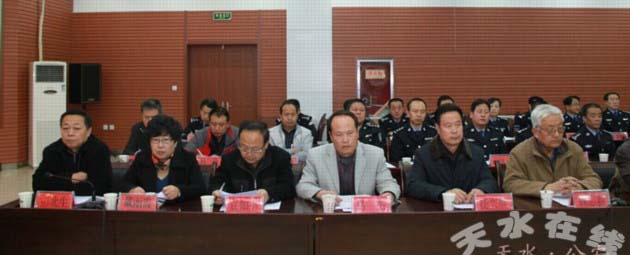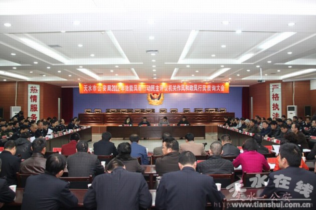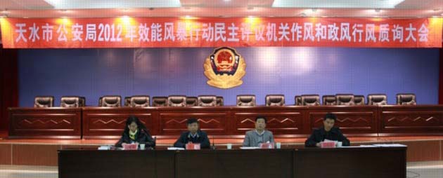 11月22日下午,天水市公安局在局機(jī)關(guān)三樓會(huì)議室組織召開了效能風(fēng)暴民主評(píng)議機(jī)關(guān)作風(fēng)和政風(fēng)行風(fēng)質(zhì)詢大會(huì)。會(huì)議聽取了市公安局黨委委員、紀(jì)委書記毛建民關(guān)于《天水市公安局2012年效能風(fēng)暴行動(dòng)民主評(píng)議機(jī)關(guān)作風(fēng)行風(fēng)報(bào)告》,宣讀了市效能風(fēng)暴行動(dòng)第四組、第八組分別對(duì)市公安局和市交警支隊(duì)所作的《評(píng)議報(bào)告》,大會(huì)還就群眾關(guān)注的道路限速、校園周邊游戲廳、市中心戒毒所建成使用等10個(gè)問題進(jìn)行了現(xiàn)場質(zhì)詢。