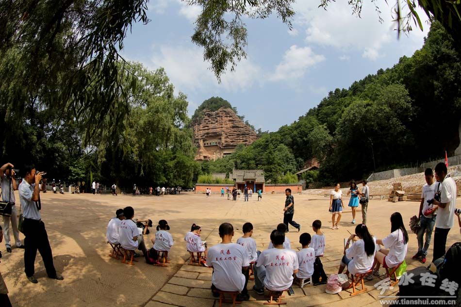 在麥積山石窟廣場記者見到天水茂森美術(shù)工作室郭茂森老師帶領(lǐng)十多名學(xué)生在寫生,記者采訪郭茂森時,他說:“麥積山石窟集北雄南秀風(fēng)光于一體,是祖國的珍寶,是繪畫創(chuàng)作的最佳對象,也是避暑的好地方。我?guī)Ш⒆觽儊磉@里寫生,既能讓孩子們學(xué)到知識,也能在炎炎夏日,讓孩子們感受到世外清涼的仙境!