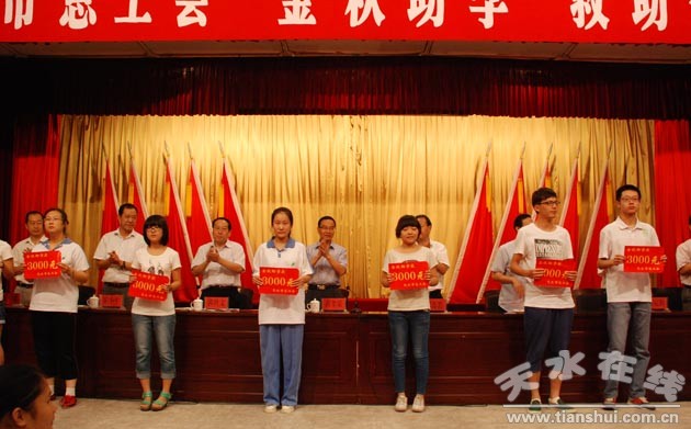 8月21日,天水市總工會舉行2013“金秋助學(xué)”救助金發(fā)放儀式。全市300余名高考被二本以上正規(guī)院校錄取的困難家庭學(xué)子獲得“金秋助學(xué)”資金幫助,救助資金共計達(dá)75萬元。