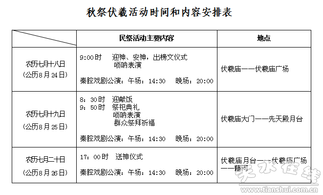 農(nóng)歷七月十九日,適逢中華人文始祖太昊伏羲氏末祭,為緬懷始祖精神,傳承伏羲文化,弘揚(yáng)中華民族尊祖、敬祖、祭祖的傳統(tǒng)美德,于癸巳年七月十八日至七月二十日(公元2013年8月24日—26日)在天水伏羲廟舉行“癸巳(2013)年秋祭中華人文始祖太昊伏羲氏典禮”活動(dòng)。屆時(shí),特邀陜西唐梨園秦腔影視劇院在伏羲廟廣場(chǎng)公演秦腔戲劇三天。8月25日當(dāng)天上午12時(shí)前,天水當(dāng)?shù)鼐用駪{身份證免票進(jìn)入廟區(qū)祭祖。