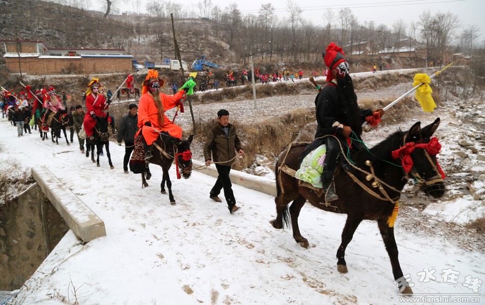 ▲2月8日,正值農(nóng)歷正月初九。一大早就飄起了雪花,且越下越大,路面逐漸濕滑,部分路段已結(jié)上了薄冰。但在清水縣白沙鄉(xiāng)太石村,傳承已久,熱鬧非凡的“馬社火”在鑼鼓聲中走村串巷、熱熱鬧鬧的“轉(zhuǎn)”了起來。 (原文鏈接:清水縣白沙鄉(xiāng)太石村“上九”耍社火)
