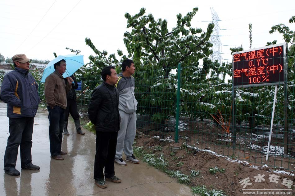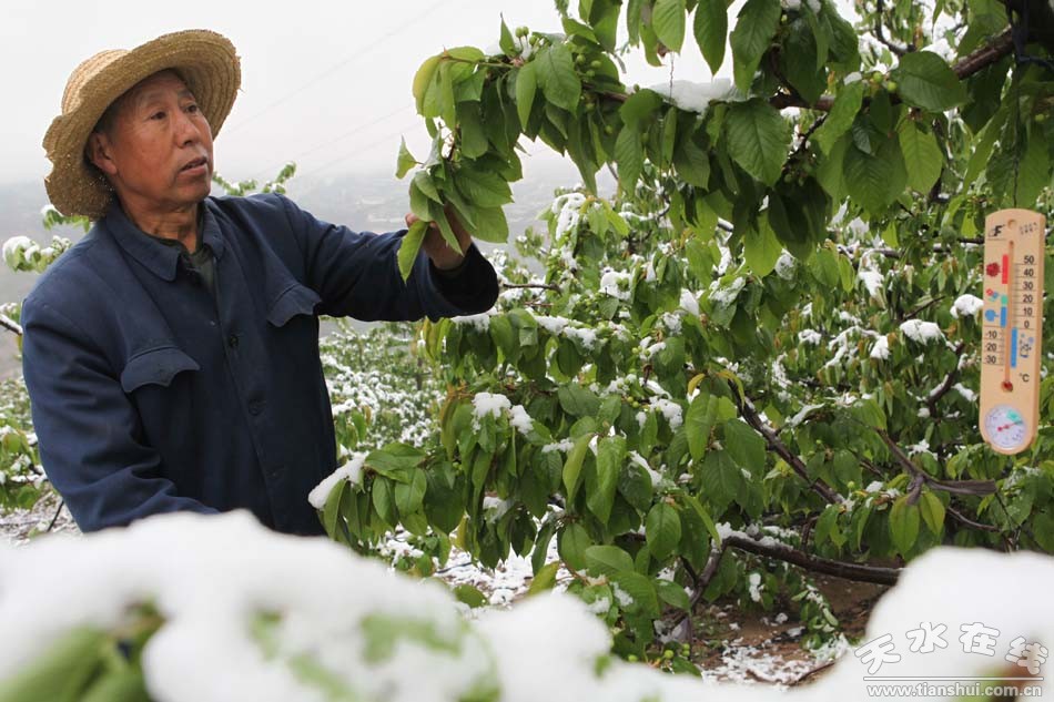 4月25日一早,記者來(lái)到麥積區(qū)南山萬(wàn)畝花牛蘋果基地時(shí),只見(jiàn)部分仍值花期的蘋果樹(shù)上,粉嫩的花瓣凍得蜷縮了起來(lái),個(gè)別樹(shù)杈則被厚厚的積雪壓折。地里地外,果農(nóng)們或抖雪理枝,或焦急守望。南山萬(wàn)畝花牛蘋果協(xié)會(huì)會(huì)長(zhǎng)武正權(quán)接受記者采訪時(shí)說(shuō):“整個(gè)基地,位置處于稍低些的果樹(shù)花已開(kāi)完,半山腰及山頂?shù)牟糠终祷ㄆ,遭遇這場(chǎng)雪,氣溫一下子從十幾度降至幾度甚至零下,這種大范圍的降雪降溫,對(duì)樹(shù)的生長(zhǎng)肯定受造成影響。”據(jù)武正權(quán)介紹,一般來(lái)說(shuō),零下1度至2度的低溫如果持續(xù)3個(gè)小時(shí)以上,樹(shù)肯定會(huì)被凍壞。然而,據(jù)該基地連夜不間斷的測(cè)溫,下雪當(dāng)晚基地零下1度至2度的氣溫持續(xù)了1個(gè)多小時(shí)就回升了,因此這場(chǎng)雪對(duì)果樹(shù)造成的災(zāi)害具體有多大,只有等24小時(shí)以后才能確切統(tǒng)計(jì)出來(lái)。
