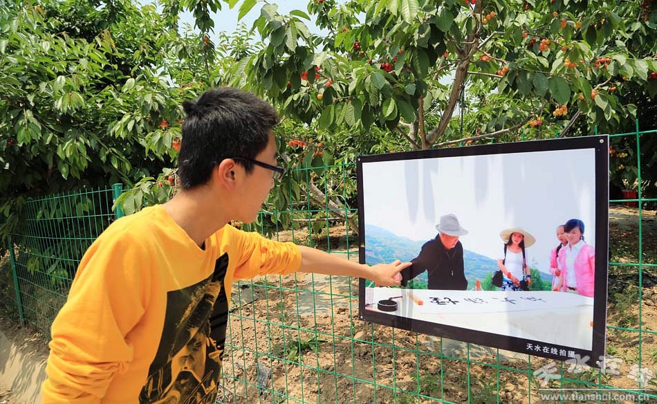 (圖為游客在觀看天水在線在煙鋪櫻桃園里舉辦的攝影作品展 天水在線攝于6月1日)