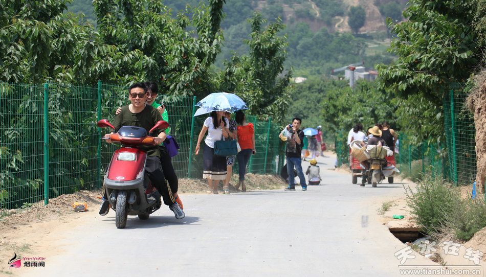 (即使是中午13時,天氣非常炎熱的情況下,煙鋪櫻桃園依然車水馬龍,游人如織。天水在線攝于6月1日)
