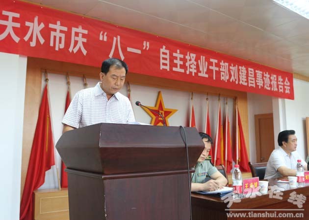 天水在線訊【通訊員郭士全 移紅霞】7月25日,在天水市慶“八一”自主擇業(yè)干部劉建昌事跡報告會上,來自天水市各行各業(yè)的自主擇業(yè)軍轉(zhuǎn)干部和天水駐市部隊的現(xiàn)役軍人代表共60多人,認真聆聽了自主擇業(yè)軍轉(zhuǎn)干部劉建昌和衛(wèi)小東、高瑞軍的自主創(chuàng)業(yè)和自謀職業(yè)的先進事跡和成功經(jīng)歷。天水軍分區(qū)、天水預(yù)備役旅及天水市人社局、市軍轉(zhuǎn)辦的有關(guān)負責任人參加了報告會。