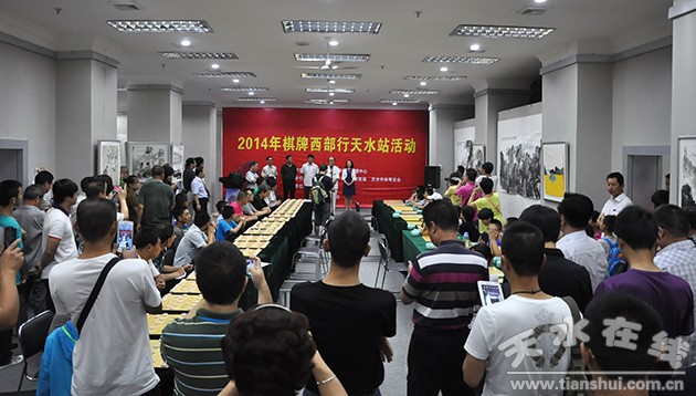 8月14日,參加2014棋牌西部行活動的棋牌國手,在天水金龍大酒店和我市選手互動。 2014棋牌西部行——甘肅站活動在蘭州、天水、白銀等市舉行,由國家體育總局棋牌運動管理中心主辦。該活動旨在促進地區(qū)公共體育服務體系建設,為當?shù)厝嗣袢罕娞峁└嘟】怠⑽拿鞯钠迮苹顒;顒赢斎,參?014棋牌西部行活動的棋牌國手還為我市選手進行了輔導。
