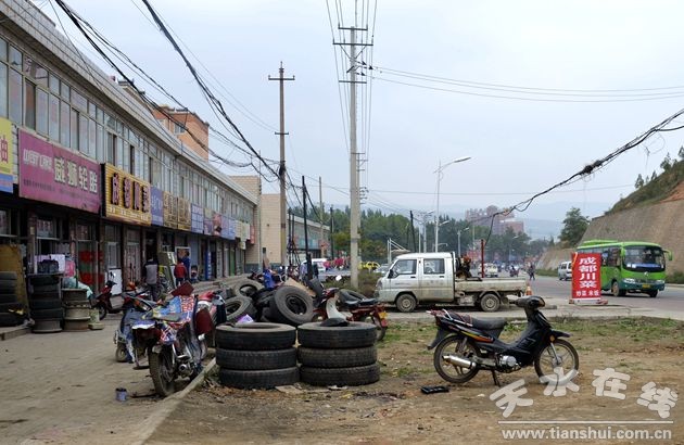 10月10日,記者跟隨工作人員來到秦州區(qū)西十里高速公路口,在高速公路出入口通往甘肅機(jī)電職業(yè)技術(shù)學(xué)院的三岔口,一幢小樓的墻面上寫著幾個(gè)醒目大字“補(bǔ)胎、汽修”,一摞摞的舊輪胎放在路邊,與周圍整潔的環(huán)境極不協(xié)調(diào)。高速公路出入口是城市的門戶,關(guān)乎城市整體形象,周邊的環(huán)境衛(wèi)生、綠化及車輛秩序極為重要,這不協(xié)調(diào)的場景暴露在天定高速路口,頓時(shí)使初來天水的人對天水的良好印象打了折扣。