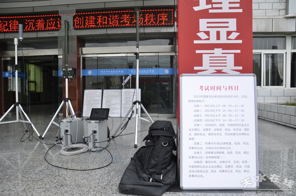今年天水市將強(qiáng)化考場監(jiān)管,首次實(shí)行“裸考”,采取五項(xiàng)措施,確保實(shí)現(xiàn)“試卷保密零事故、卡卷回收零差錯(cuò)、考試違紀(jì)零容忍、考生服務(wù)零投訴”的工作目標(biāo)。一是由市司法局統(tǒng)一為應(yīng)試人員免費(fèi)提供考試用品,并在每個(gè)考場配備“靜音時(shí)鐘”,提供飲用水。應(yīng)試人員除準(zhǔn)考證和本人身份證外,禁止攜帶手表或其他計(jì)時(shí)工具參加考試,其他物品需放置在考場指定地點(diǎn),一律不準(zhǔn)帶入考場。二是啟用考點(diǎn)安全管理系統(tǒng),門口確定專人運(yùn)用二代身份證逐人掃描檢測、核準(zhǔn)應(yīng)試人員身份信息,每個(gè)考場配備手機(jī)信號(hào)屏蔽儀,全程運(yùn)用手持金屬探測器、耳麥識(shí)別儀等防作弊器材。三是布置無線電監(jiān)測車對(duì)考點(diǎn)周邊無線電信號(hào)進(jìn)行監(jiān)控,公安網(wǎng)監(jiān)現(xiàn)場配合,形成預(yù)防和打擊一體化的反作弊防控體系。四是強(qiáng)化輿情監(jiān)管,組織編寫印發(fā)了200冊(cè)《國家司法考試手冊(cè)》和1000冊(cè)《考生須知》,廣泛宣傳司法考試制度的意義和成果,宣傳報(bào)考政策、報(bào)考條件和參考信息,把“依法治考、從嚴(yán)治考、誠信參考”的主題貫穿始終。五是整合各方面資源,及時(shí)妥善處置虛假有害信息,在考點(diǎn)的每個(gè)教室、樓道書寫宣傳口號(hào)、標(biāo)語,在門口懸掛橫幅,以司法文化感染考生、激勵(lì)考生、鼓舞考生,為考生創(chuàng)造一個(gè)公平、公正、公開、安全的考試環(huán)境。