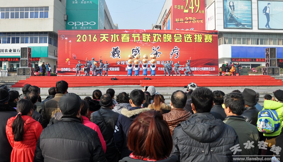 12月26日上午,由中共天水市委宣傳部,天水市文化和旅游局主辦,天水市演出公司、天水傳統(tǒng)養(yǎng)生文化研究會(huì)、天水盛典文化承辦的為期兩天的2016天水市春節(jié)聯(lián)歡晚會(huì)選拔賽在龍城廣場(chǎng)拉開(kāi)帷幕。此次春晚選拔賽自10月份啟動(dòng)以來(lái),備受我市各界群眾關(guān)注,來(lái)自全市的60多支隊(duì)伍報(bào)名參加,參賽人數(shù)達(dá)到1000多位,通過(guò)大眾評(píng)委的評(píng)比將選拔出20支隊(duì)伍參加元月16日的錄制。2016天水市春節(jié)聯(lián)歡晚會(huì),作為天水市2016年春節(jié)重點(diǎn)文化活動(dòng),將于農(nóng)歷臘月二十九日在天水電視臺(tái)播出。