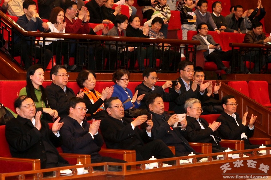 天水在線3月7日北京訊 正值全國“兩會”召開之際,3月7日晚,天水市西秦腔研究院創(chuàng)排的新編歷史秦劇《大秦文公》在北京長安大戲院精彩上演。國務(wù)院扶貧辦主任劉永富,甘肅省人大常委會副主任羅笑虎,中國藝術(shù)研究院院長連輯,甘肅省副省長夏紅民,甘肅省高級人民法院院長梁明遠,原中國文聯(lián)黨組書記胡振明,甘肅省文化廳副廳長楊建仁,甘肅省文聯(lián)副主席曹銳,天水市委常委、宣傳部長王正茂,天水市副市長張建杰等觀看了演出。