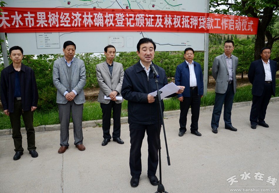 5月6日下午,全市果樹經(jīng)濟林確權(quán)登記頒證及林權(quán)抵押貸款工作啟動儀式在麥積區(qū)南山萬畝花牛蘋果基地舉行。副市長霍衛(wèi)平出席啟動儀式并講話。