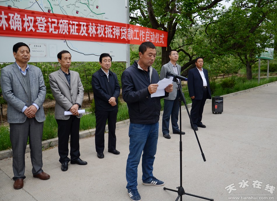 啟動儀式上,市林業(yè)局主要負(fù)責(zé)人對全市果樹經(jīng)濟林確權(quán)登記頒證及林權(quán)抵押貸款工作作了安排部署;麥積區(qū)政府、甘肅銀行天水分行、麥積區(qū)新民蘋果種植專業(yè)合作社負(fù)責(zé)人進行了發(fā)言。