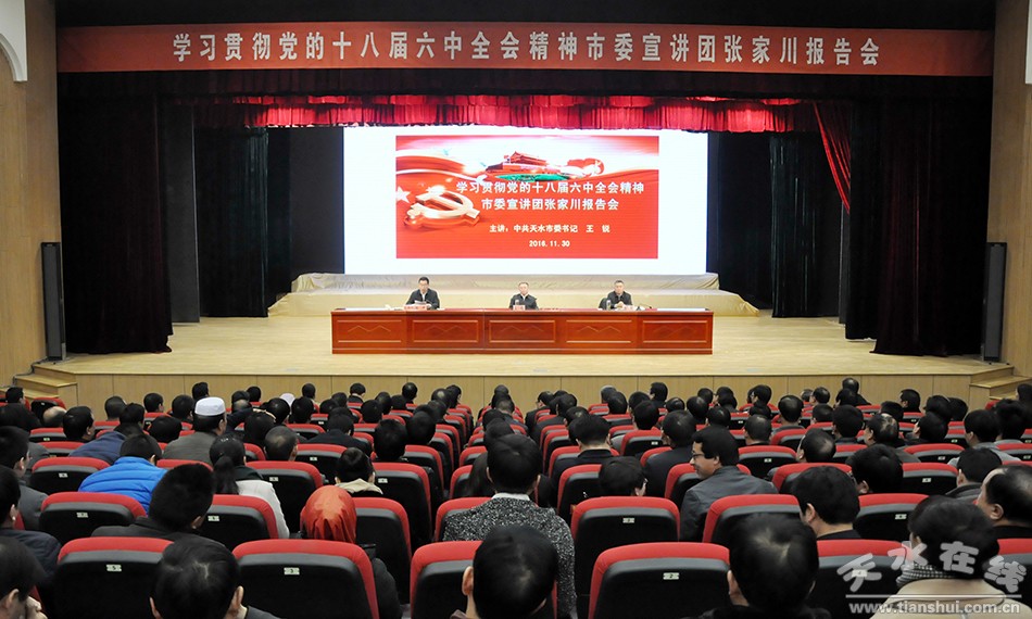11月23日上午,舉行學(xué)習(xí)貫徹黨的十八屆六中全會(huì)精神省委宣講團(tuán)天水報(bào)告會(huì),對(duì)我市開展黨的十八屆六中全會(huì)精神宣講工作提出明確要求。當(dāng)天下午,市委立即召開市委常委會(huì),對(duì)全市集中開展黨的十八屆六中全會(huì)精神宣講活動(dòng)進(jìn)行了專題研究,及時(shí)發(fā)出《全市學(xué)習(xí)貫徹黨的十八屆六中全會(huì)精神宣講工作方案》的通知,對(duì)宣講工作進(jìn)行部署。