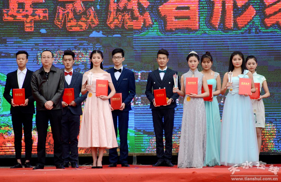 (天水市委宣傳部副部長趙子洲、市文明辦主任張秀麗為榮獲大賽形象大使稱號(hào)選手頒獎(jiǎng))