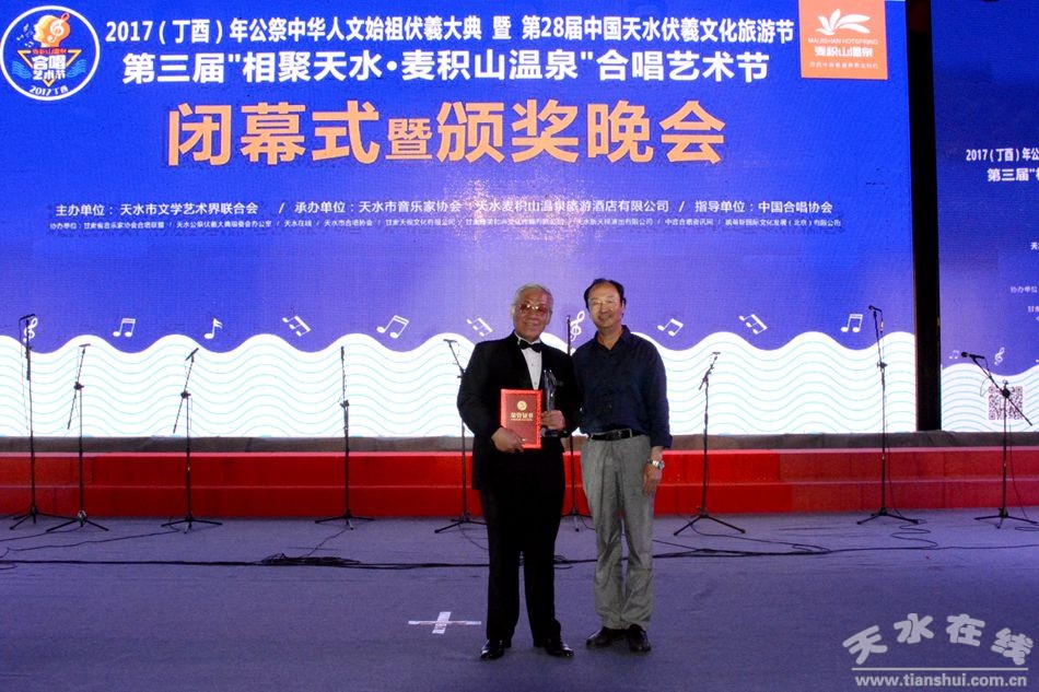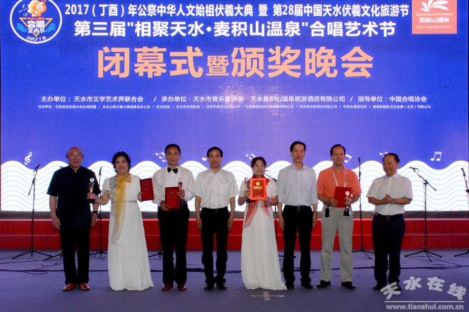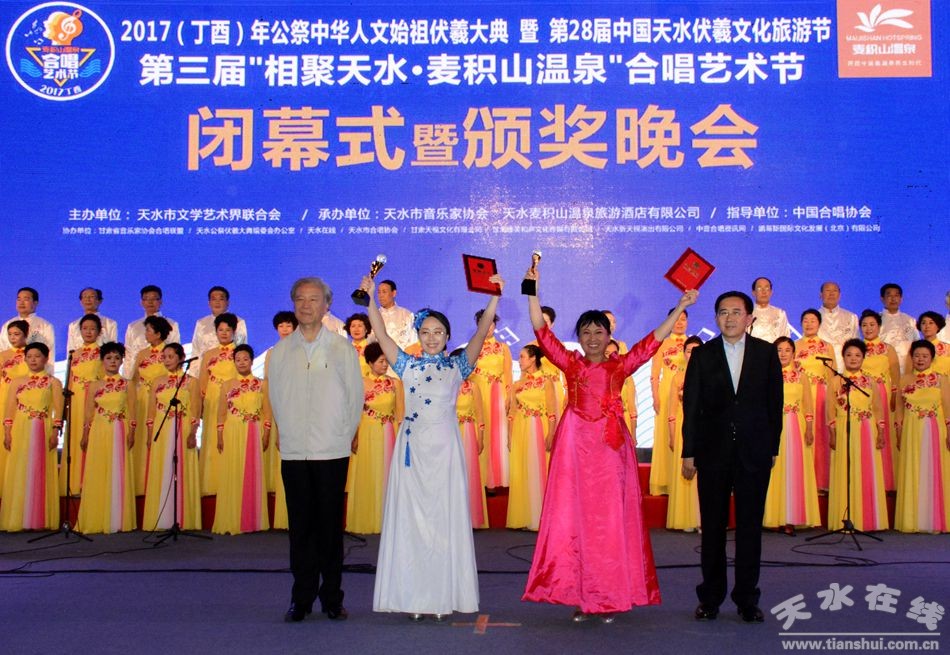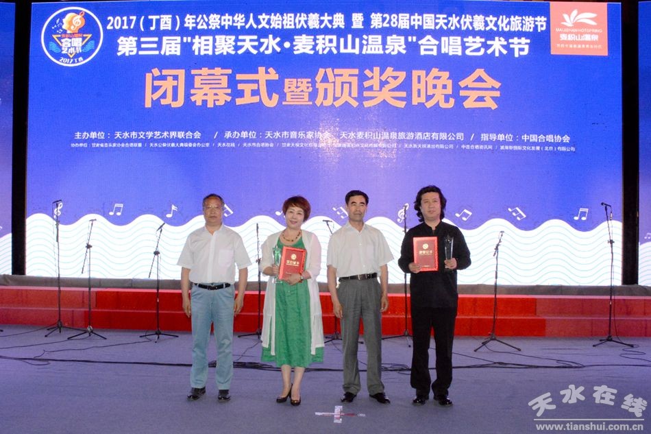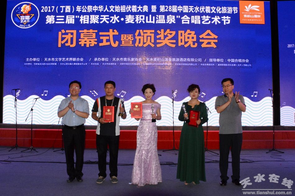 “每一次相聚,難說再見……”6月20日晚,在《天水,你好》這首滿含一腔深情的合唱藝術(shù)節(jié)閉幕式會(huì)歌中,由天水在線策劃,天水市文學(xué)藝術(shù)界聯(lián)合會(huì)主辦,天水市音樂家協(xié)會(huì)、天水市麥積山溫泉旅游酒店有限公司承辦的2017(丁酉)年公祭中華人文始祖伏羲大典暨第28屆中國·天水伏羲文化旅游節(jié)第三屆“相聚天水·麥積山溫泉”合唱藝術(shù)節(jié)在天水市龍城廣場(chǎng)落下帷幕。本屆合唱藝術(shù)節(jié)共產(chǎn)生了2名一等獎(jiǎng),3名二等獎(jiǎng)、4名三等獎(jiǎng)和2名優(yōu)秀指揮獎(jiǎng)以及1名優(yōu)秀鋼琴伴奏獎(jiǎng)。 天水市職工合唱團(tuán)奪得一等獎(jiǎng)。