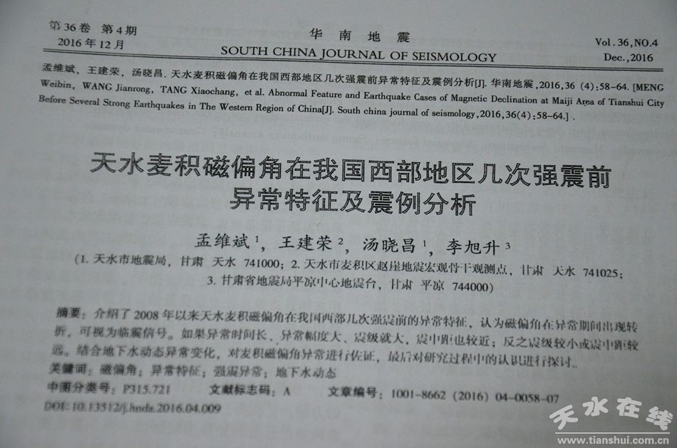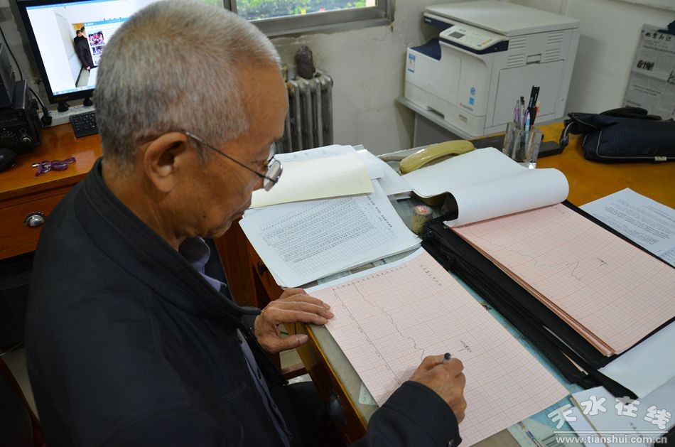 從那時起,無論風(fēng)霜雨雪,王建榮都堅持在每天的8時、14時、20時三個時間段進(jìn)行觀測,必要時還得加密觀測。同時,他還自費收集天水及鄰近地區(qū)30多個臺站的地下流體資料,結(jié)合磁偏角數(shù)據(jù),在坐標(biāo)紙上點繪,然后進(jìn)行綜合研究,形成震情分析報告。這些原本需要大量人力物力財力的工作,王建榮一干就是23年。