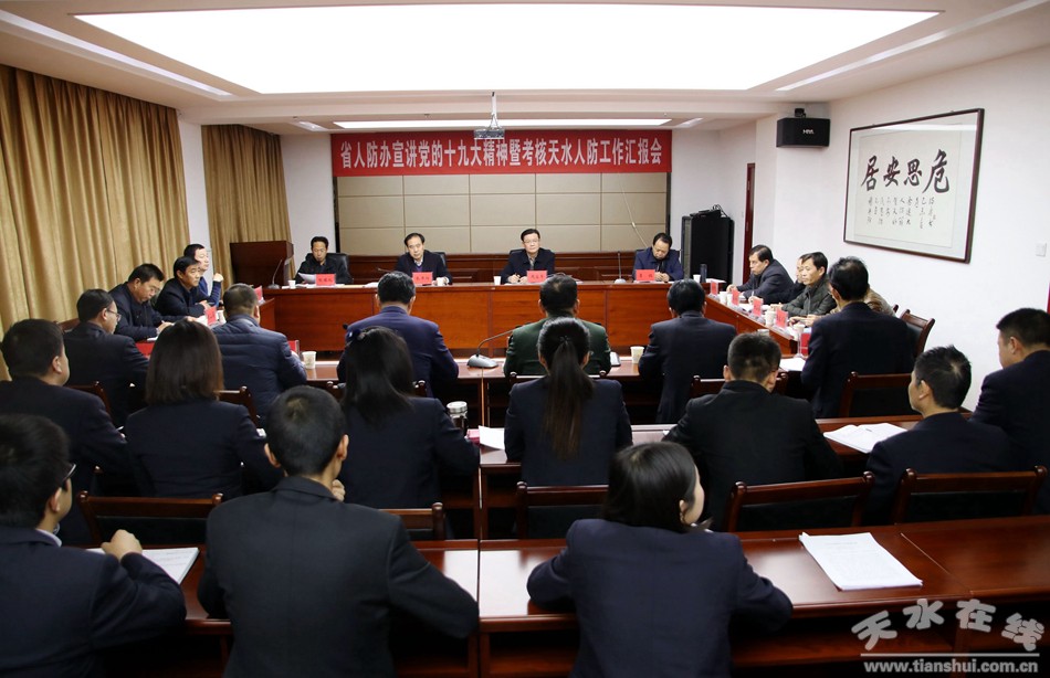12月12日,省人防辦主任周應(yīng)軍帶領(lǐng)考核組,考核我市2017年人防工作,宣講黨的十九大精神,對接2018年重點工作任務(wù)。 天水市副市長程偉東、天水軍分區(qū)司令員李建中一同考核。