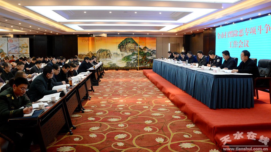 2月9日下午,天水市召開掃黑除惡專項斗爭工作會議,會議傳達(dá)了市委書記王銳、市長王軍對全市開展掃黑除惡專項斗爭的批示。市人大常委會主任、市委秘書長、市委政法委書記蔣曉強(qiáng)對全市掃黑除惡專項斗爭工作作了安排部署。市紀(jì)委、市委組織部負(fù)責(zé)同志分別就紀(jì)檢監(jiān)察和組織部門在專項斗爭中的工作安排作了發(fā)言。市中級法院院長馬忠福、市檢察院檢察長張發(fā)魁出席會議。市政府黨組成員、市公安局局長馬瑛主持會議。