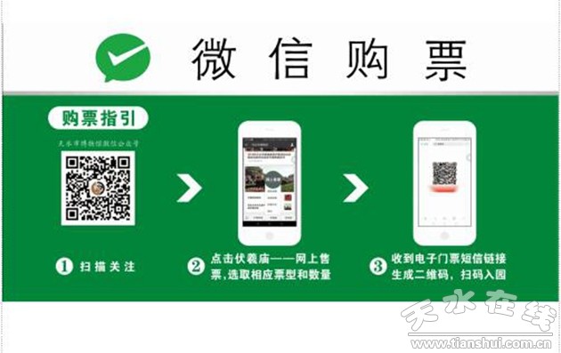 游客通過掃描天水市博物館官方微信公眾號,點(diǎn)擊“伏羲廟→網(wǎng)上售票”,完成微信支付后,收到電子門票短信鏈接生成的二維碼通過匝機(jī)掃碼進(jìn)入景區(qū)。