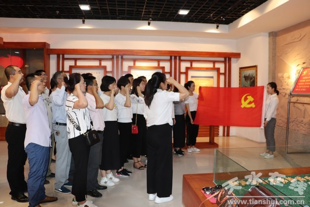 機(jī)關(guān)全體黨員參觀了武山縣紅軍長征強(qiáng)渡渭河紀(jì)念館,黨員們佩戴黨徽,面對黨旗,重溫入黨誓詞,回顧入黨宣誓時的莊嚴(yán)承諾和堅定決心,喚醒先進(jìn)意識,增強(qiáng)黨性意識,以更加飽滿的熱情發(fā)揮共產(chǎn)黨員的先鋒模范作用。在講解員解說下,館內(nèi)歷史實(shí)物、珍貴圖片和文獻(xiàn)資料等向黨員們?nèi)轿徽故玖烁锩攘业膷槑V歲月,黨員們深切感受革命先烈們?yōu)榱巳嗣裥腋、民族解放和國家富?qiáng),忠貞不屈、舍生忘死的犧牲精神,對革命先烈的奉獻(xiàn)精神肅然起敬,并對先烈們用熱血的換來的美好生活表示珍惜。