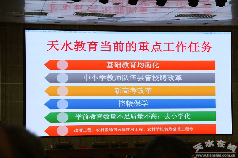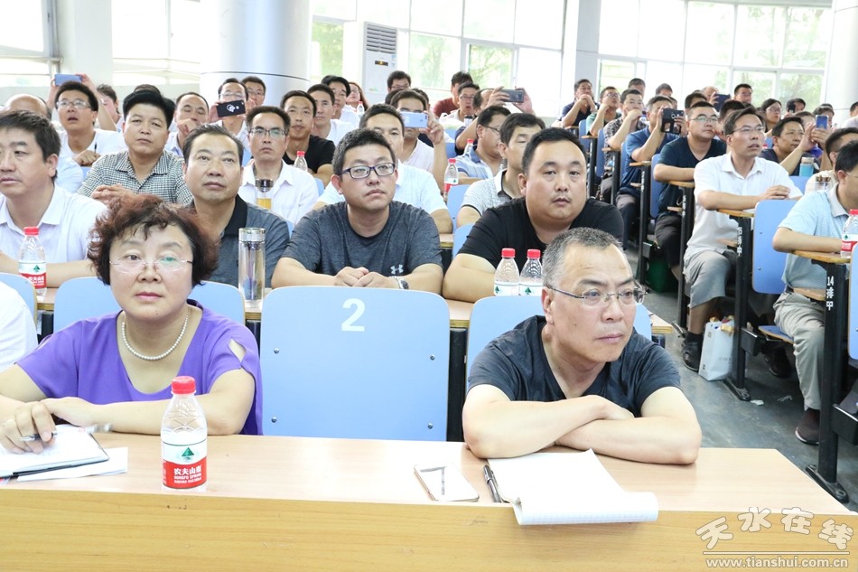 宮輝在講座中首先引用自己在全市基層學(xué)校調(diào)研的案例,以科學(xué)真實(shí)的天水基礎(chǔ)教育數(shù)據(jù)為支撐,論述了“一位好校長(zhǎng)就能辦出一所好學(xué)!钡慕逃},拋出了“好校長(zhǎng)是什么樣的?天水需要什么樣的校長(zhǎng)?如何成為天水好校長(zhǎng)?”三個(gè)方面的問(wèn)題,然后用“靈魂軀體論、個(gè)性素養(yǎng)論、人際角色論、規(guī)模差異論、價(jià)值追求論”詮釋了校長(zhǎng)角色的內(nèi)涵以及現(xiàn)代校長(zhǎng)必須具備的優(yōu)秀品質(zhì),緊接著以天水教育當(dāng)前面臨的基礎(chǔ)教育均衡化、中小學(xué)教師隊(duì)伍縣管校聘改革、新高考改革、學(xué)前教育發(fā)展、全面改薄工程、農(nóng)村教師宿舍周轉(zhuǎn)房工程、農(nóng)村學(xué)校供熱溫暖工程等重點(diǎn)工作任務(wù)為切入點(diǎn),突出強(qiáng)調(diào)了培養(yǎng)一大批好校長(zhǎng)對(duì)于推動(dòng)天水教育提速發(fā)展的重要性和迫切性。