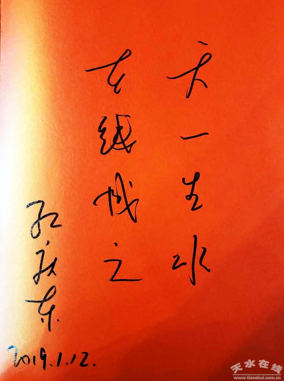 1月12日,孔子第七十三代傳人,北京大學(xué)中文系教授、博士,中國(guó)古今文化著名講師,央視《百家講壇》主講人——孔慶東來(lái)到天水,參加佳·朗園墅境美學(xué)發(fā)布盛典,在登臺(tái)演講結(jié)束后,孔慶東先生為現(xiàn)場(chǎng)直播本次活動(dòng)的天水在線題詞:天一生水,在線成之。