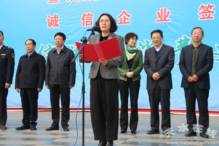 活動儀式上,市市場監(jiān)管局黨組書記、局長王宏瑋介紹了2019年天水市“3·15”消費(fèi)維權(quán)年主題內(nèi)涵及系列活動安排;黨組成員、副局長聶惠仁宣布“雙隨機(jī)、一公開”抽查結(jié)果;秦州區(qū)市場監(jiān)管局主要負(fù)責(zé)人進(jìn)行了表態(tài)發(fā)言;天水移動公司負(fù)責(zé)人代表誠信企業(yè)宣讀了“3.15誠信宣言”;誠信企業(yè)進(jìn)行了誠信承諾簽名活動。
