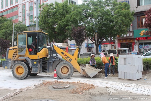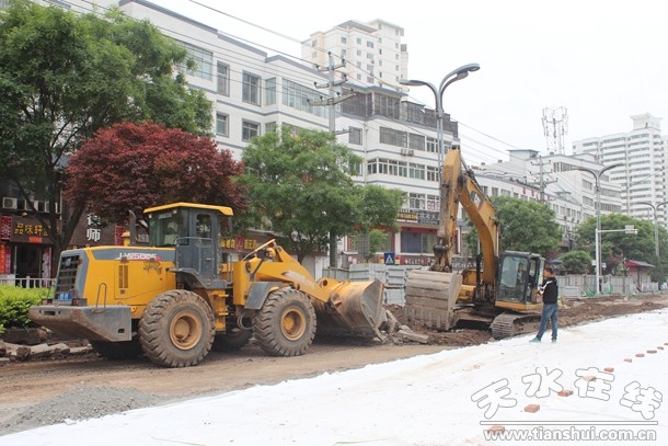 (成紀(jì)大道西路提升改造工程綠色市場段正在進(jìn)行馬路路緣石鋪設(shè)前的準(zhǔn)備工作)