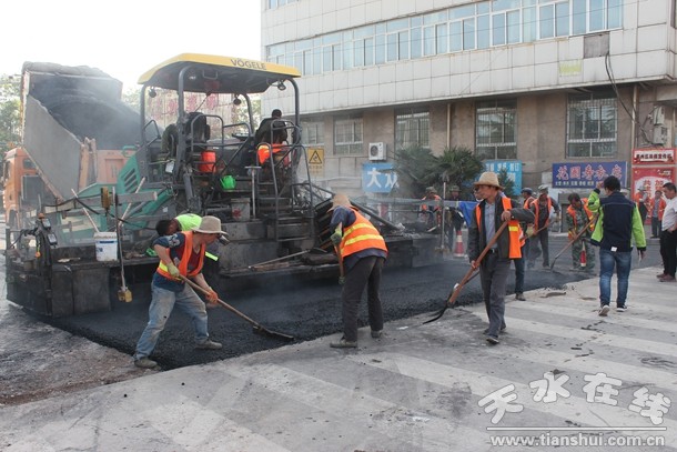 (成紀(jì)大道西路提升改造工程第三中學(xué)段正在進(jìn)行道路水穩(wěn)層鋪設(shè))