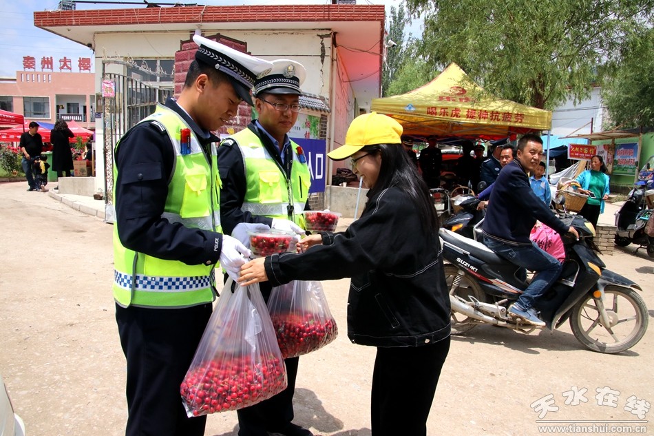 5月28日,天水在線和煙鋪村果農(nóng)向在煙鋪村保障櫻桃交易秩序和交通秩序的交警和城管送上煙鋪大櫻桃,請(qǐng)他們品嘗,感謝他們?yōu)楣r(nóng)著想!