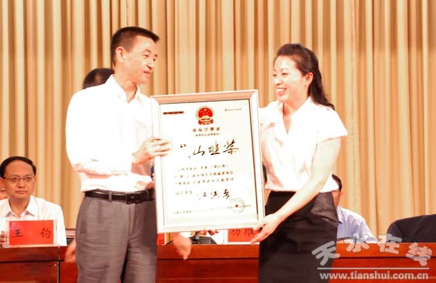 ▲甘肅省工商局黨組成員、副局長(zhǎng)宋金圣(左)為“武山韭菜”獲得國(guó)家地理標(biāo)志證明商標(biāo)授牌