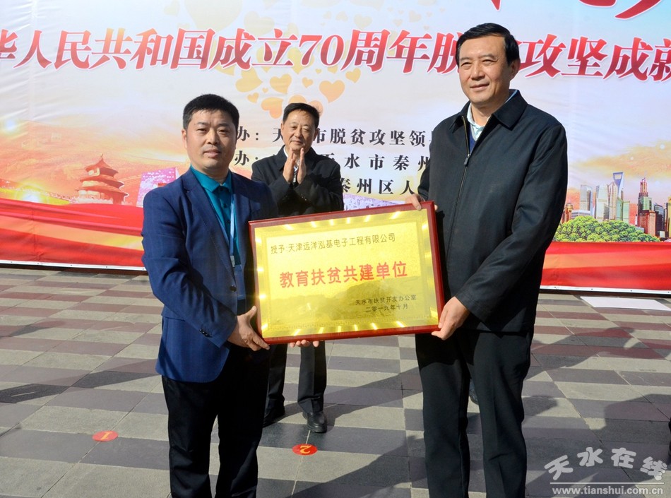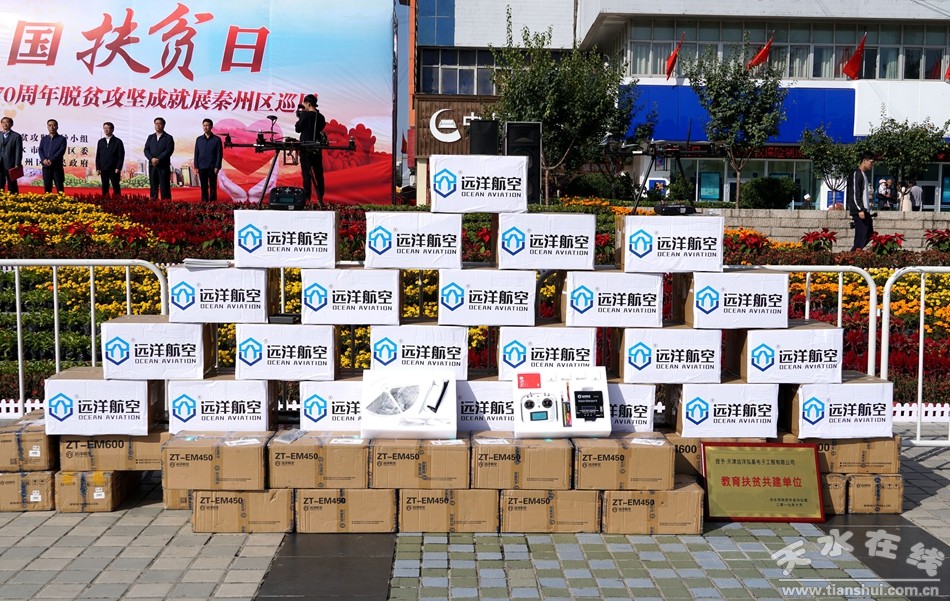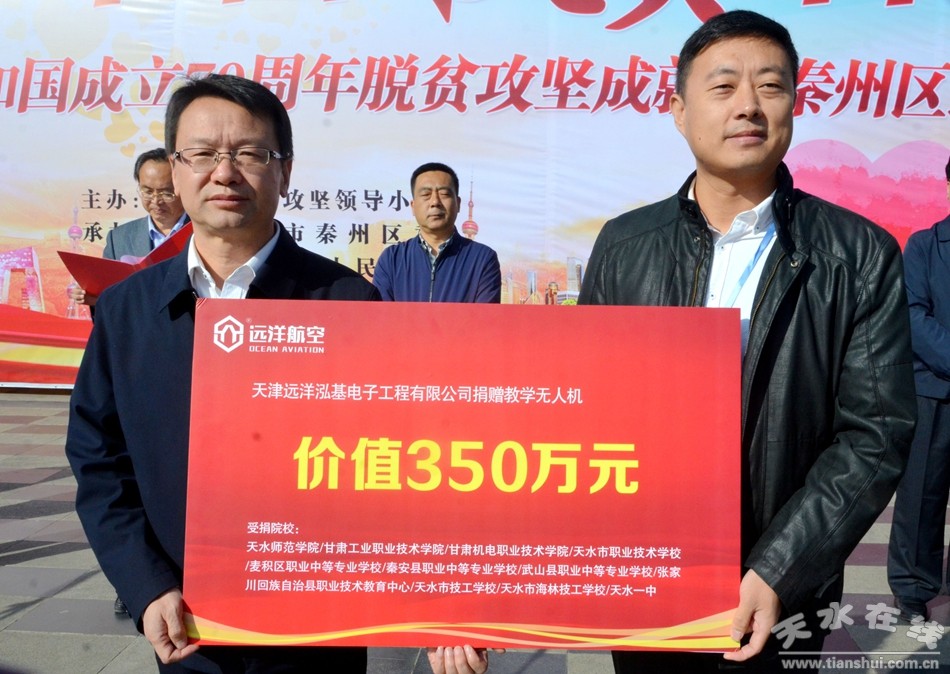 活動中,天津遠洋鴻基電子工程有限公司與我市13所中高職院校簽訂了《無人機助學圓夢捐贈協(xié)議》,并現(xiàn)場捐贈了價值350萬元的教學無人機,趙衛(wèi)東向天津遠洋鴻基電子工程有限公司頒發(fā)了榮譽證書。活動當天,我市還在龍城廣場布置了天水市慶祝中華人民國和國成立70周年脫貧攻堅成就展,有關部門還就行業(yè)扶貧政策進行了現(xiàn)場宣傳。