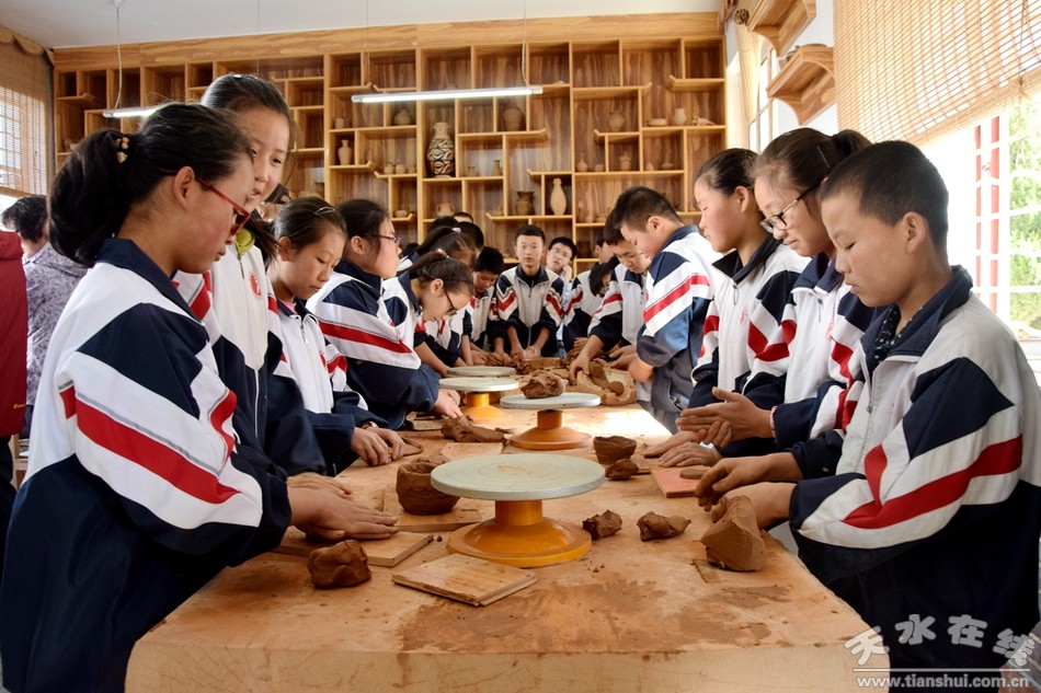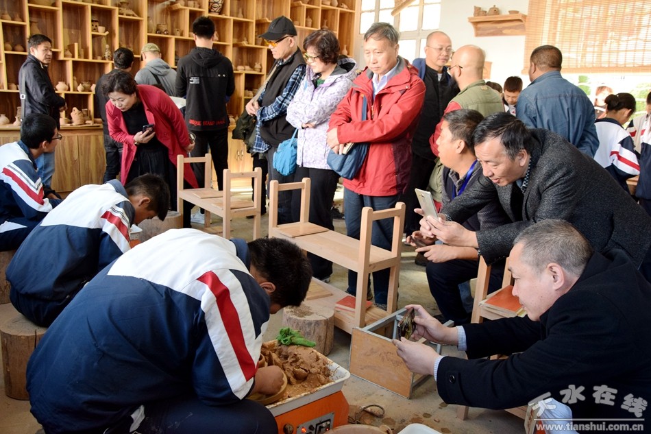 近午時(shí)分,采風(fēng)團(tuán)乘車前往秦安。下午首先抵達(dá)了秦安縣五營(yíng)中學(xué),參觀陶文化和校園詩歌創(chuàng)作。教室內(nèi),學(xué)生們宛如一個(gè)個(gè)手藝精湛的陶藝匠人,將看似平淡無奇的原材料化作一件件藝術(shù)品,引得詩人、作家們嘖嘖稱嘆。采風(fēng)團(tuán)與學(xué)生們進(jìn)行了深入的交流,不僅學(xué)習(xí)和了解了該校的陶文化普及,也在校園詩歌創(chuàng)作方面向?qū)W生們分享了自己的經(jīng)驗(yàn)。
